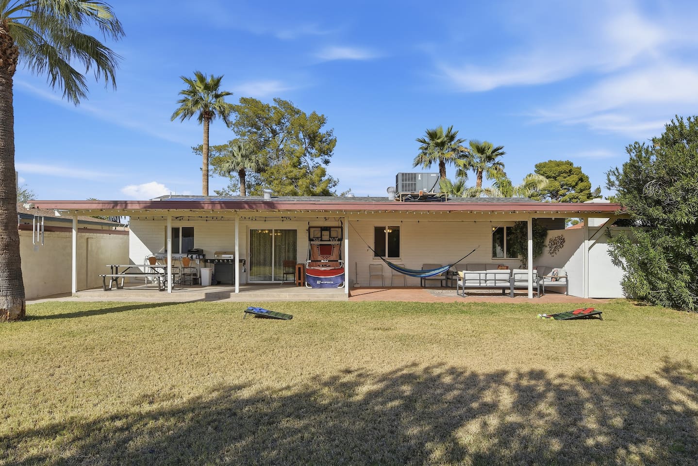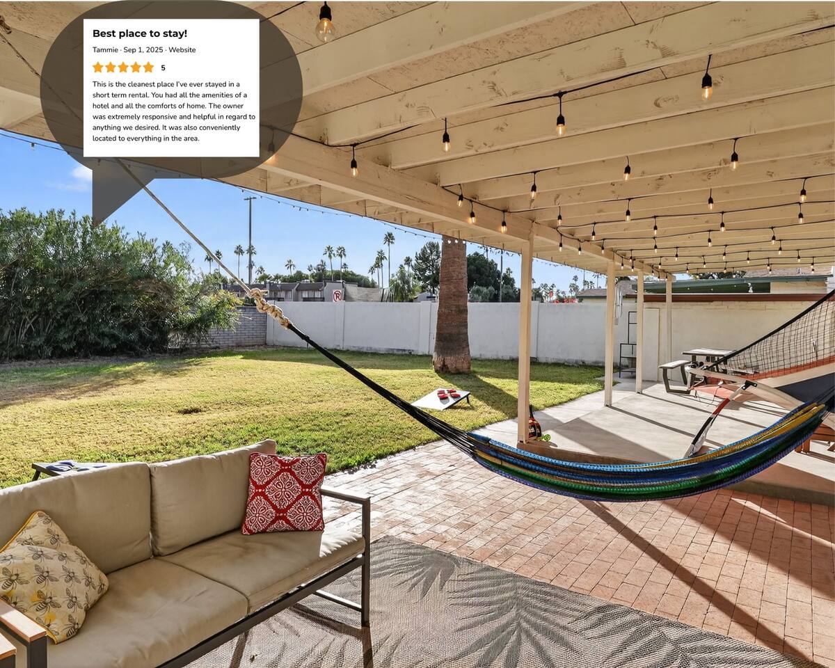 Relax in this newly remodeled 3BR Mesa home designed for comfort and easy living. Enjoy a bright living room, fully equipped kitchen, covered patio with BBQ and hammock, and a spacious grassy yard. Located in the desirable Dobson Ranch community, you’re minutes from freeways, dining, golf, parks, and Tempe; perfect for families, couples, or extended stays.